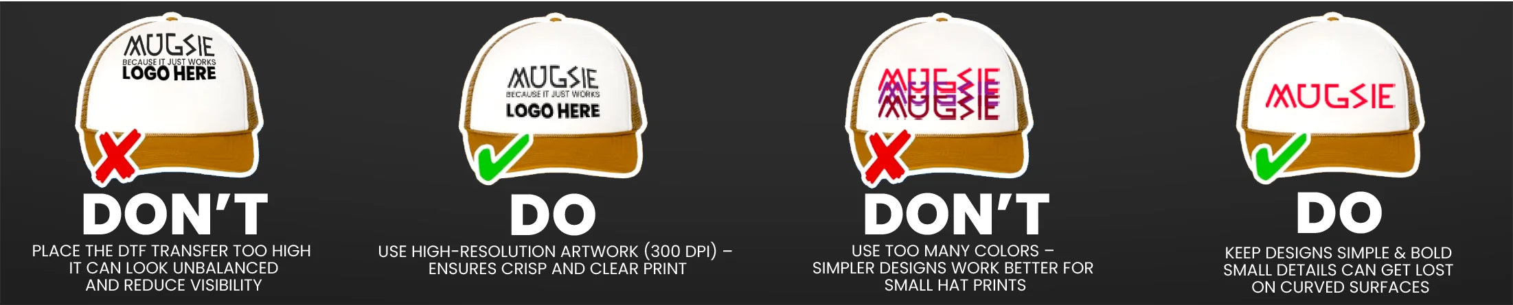 ❌ Don’t use too many colors—simpler designs work better for smaller hat prints.