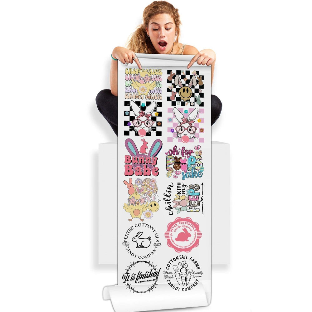 DTF transfer sheets are individual Easter designs printed on transfer film. Gang sheets contain multiple spring designs on one larger sheet to reduce costs - perfect for outfitting the whole family for Easter or creating multiple children's outfits! You get various Easter themes on one sheet and cut them apart for different family members. Learn optimal sizing with our DTF Sizing Guide for children's and adult Easter apparel.