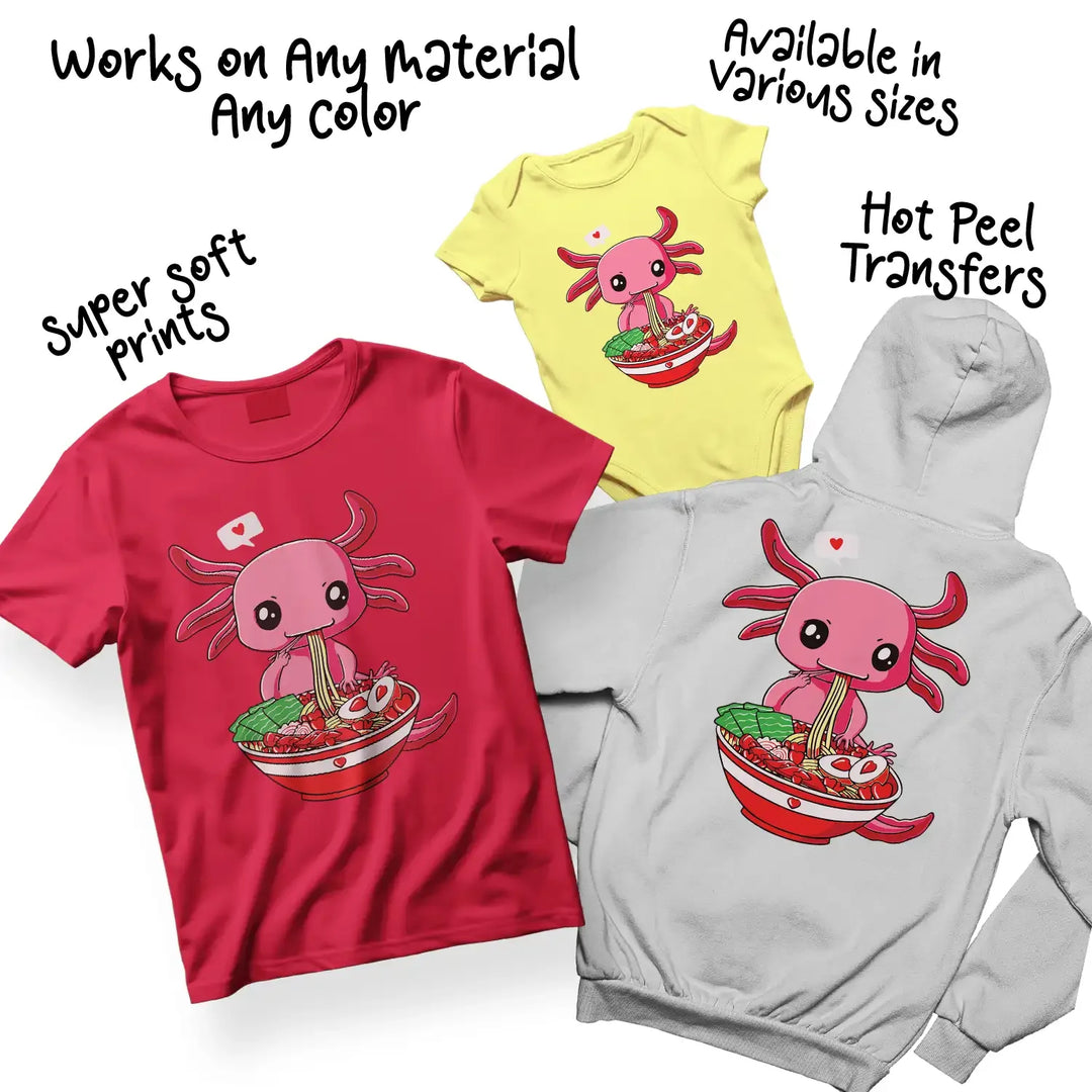 Design unique aquatic-themed Valentine's apparel with these DTF transfers applications. Works wonderfully on t-shirts, hoodies, sweatshirts, tank tops, and more. Perfect for axolotl lovers, marine biology enthusiasts, kawaii fashion fans, or anyone who adores these adorable amphibians with anime styling.