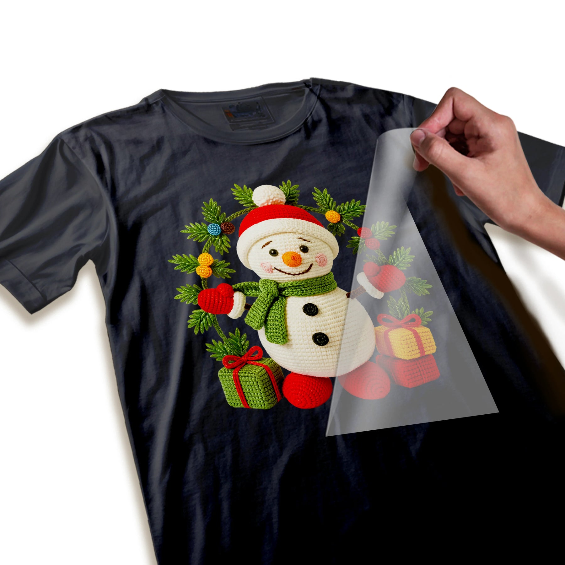 Transform your holiday apparel with this charming crochet-inspired snowman wreath DTF transfer. This delightful design features an adorable snowman wearing a classic red Santa hat and green scarf, surrounded by a festive evergreen wreath decorated with colorful ornaments and wrapped presents.