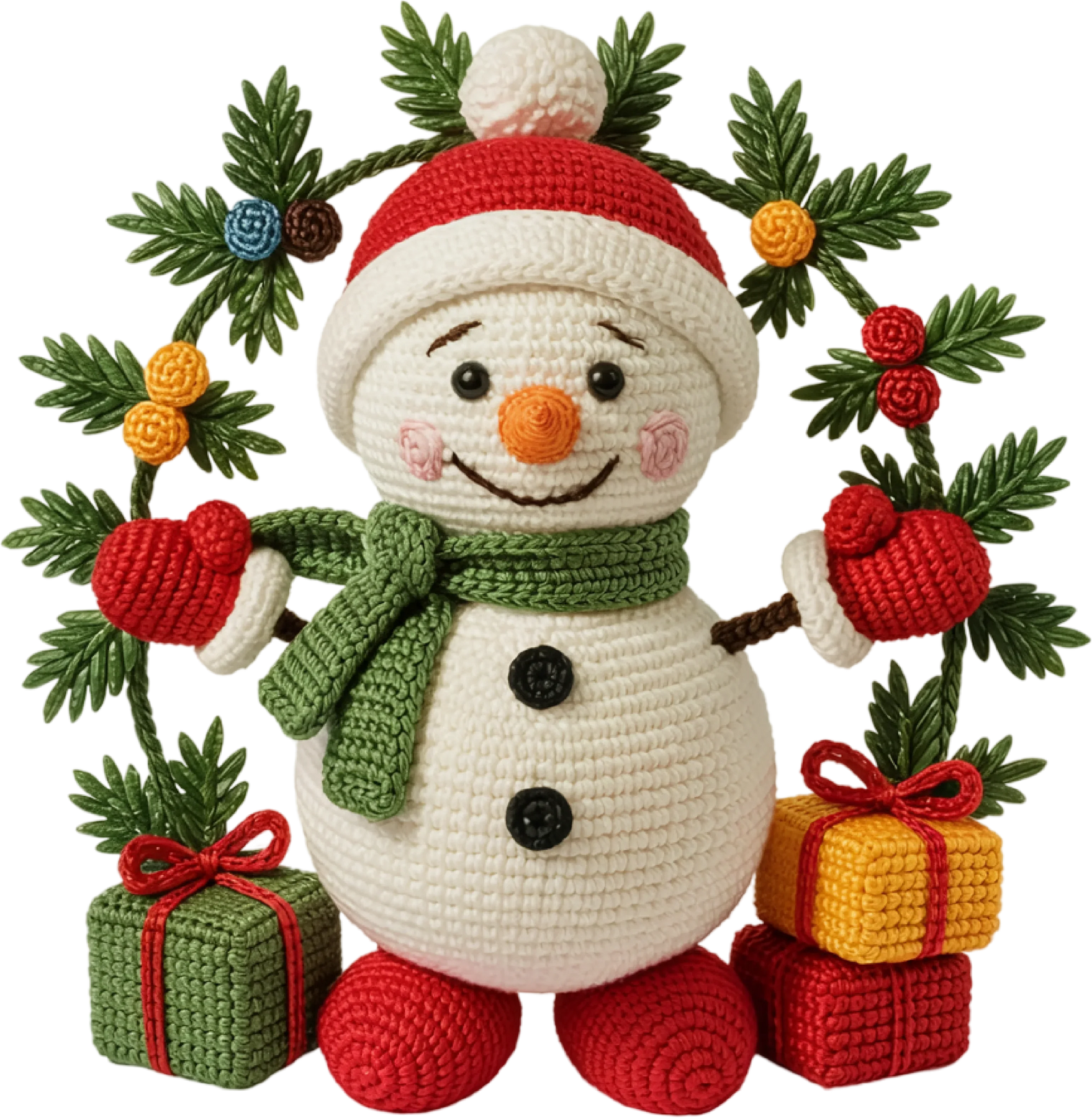 - Whimsical crochet-textured snowman with rosy cheeks and cheerful smile