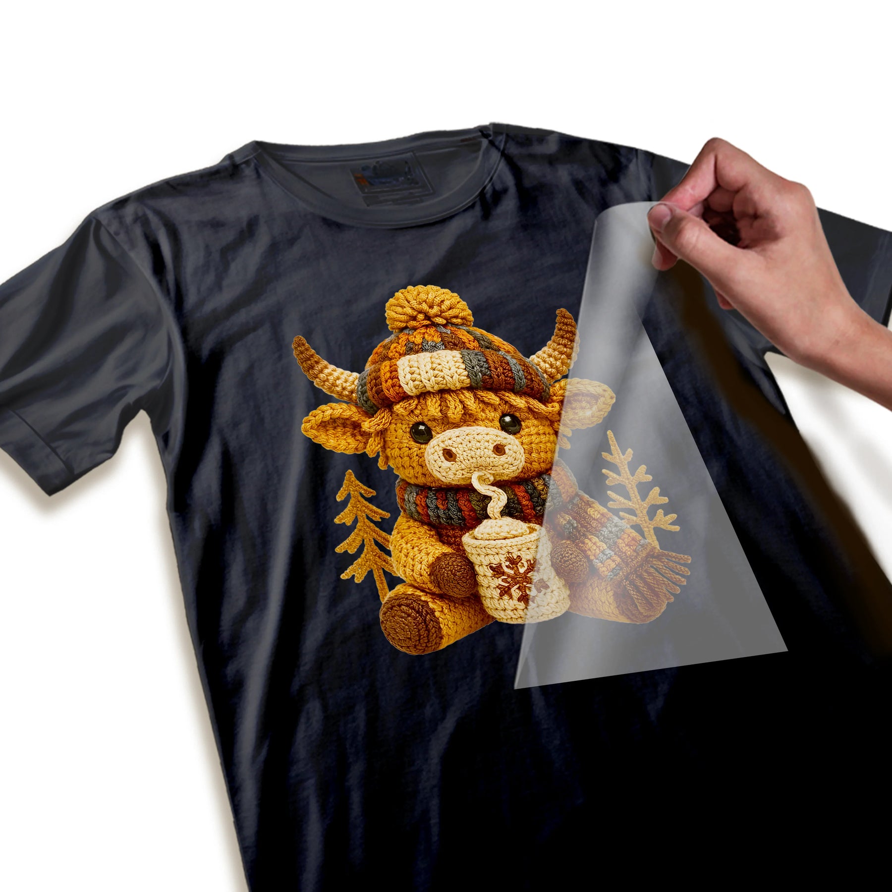 This highland bull design works beautifully on various garments and fabrics. Learn more about Compatible Fabrics for DTF and use our DTF Sizing Guide to choose the perfect size for your project.
