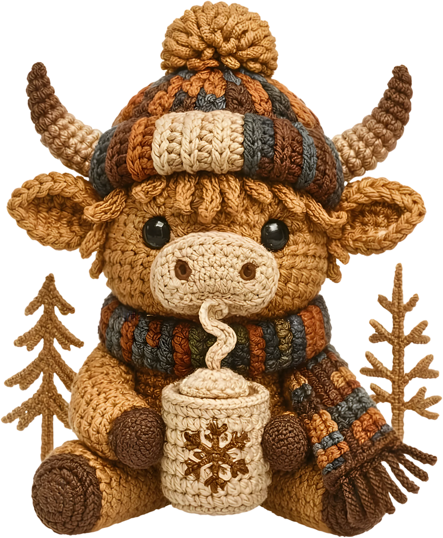 Transform your holiday apparel with this adorable crocheted-style highland bull Christmas DTF transfer. This charming winter design features a cozy highland bull wearing a festive striped scarf and holding a warm cup of cocoa, surrounded by delicate winter branches. Perfect for creating memorable Christmas gifts and seasonal merchandise.