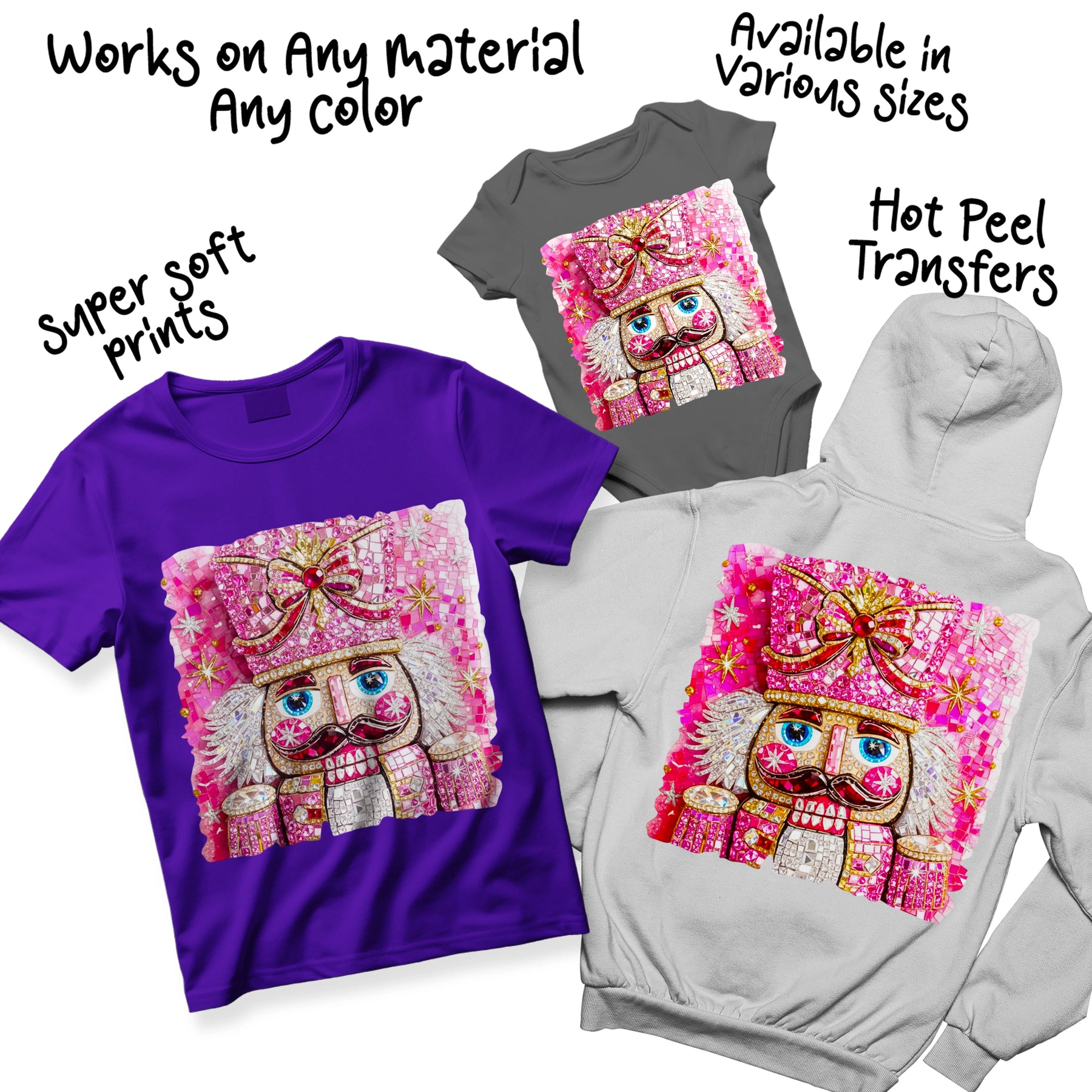 Transform your holiday apparel with this stunning rhinestone-embellished pink nutcracker DTF transfer. This premium design features intricate sequin and jeweled details that create a luxurious, textured appearance perfect for festive clothing and accessories.