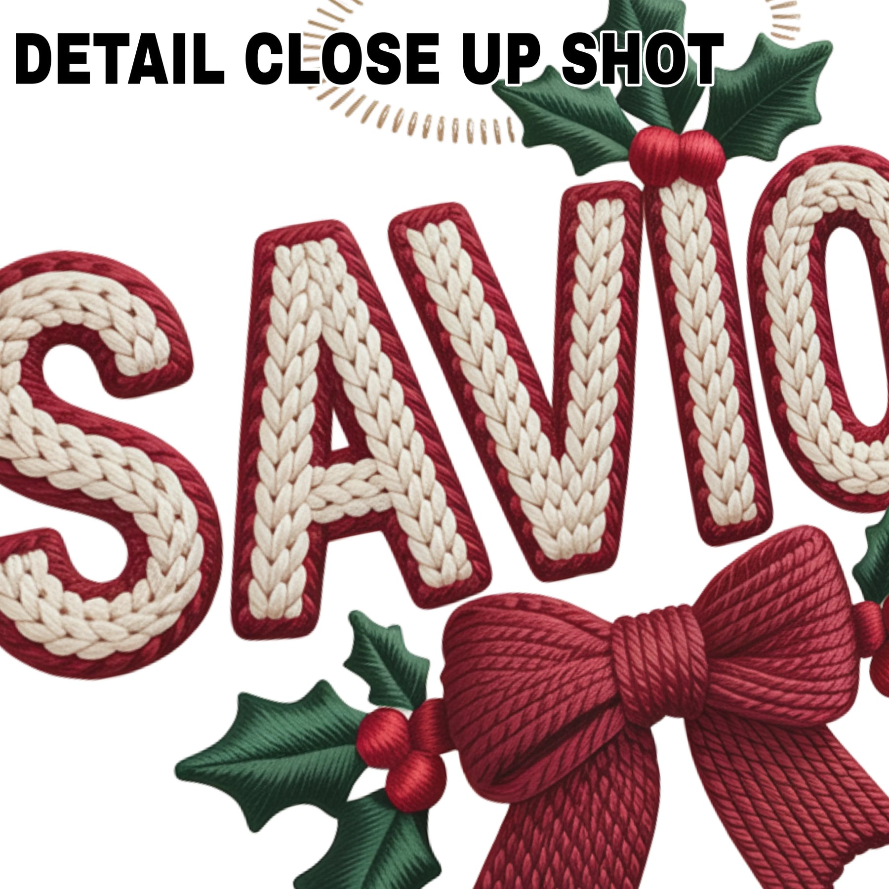 Transform your holiday apparel with this beautiful Christmas DTF transfer featuring the word "SAVIOR" in elegant knit-textured lettering. The design showcases cream and burgundy colors with realistic yarn-like texture, adorned with festive holly leaves, berries, and a decorative bow.