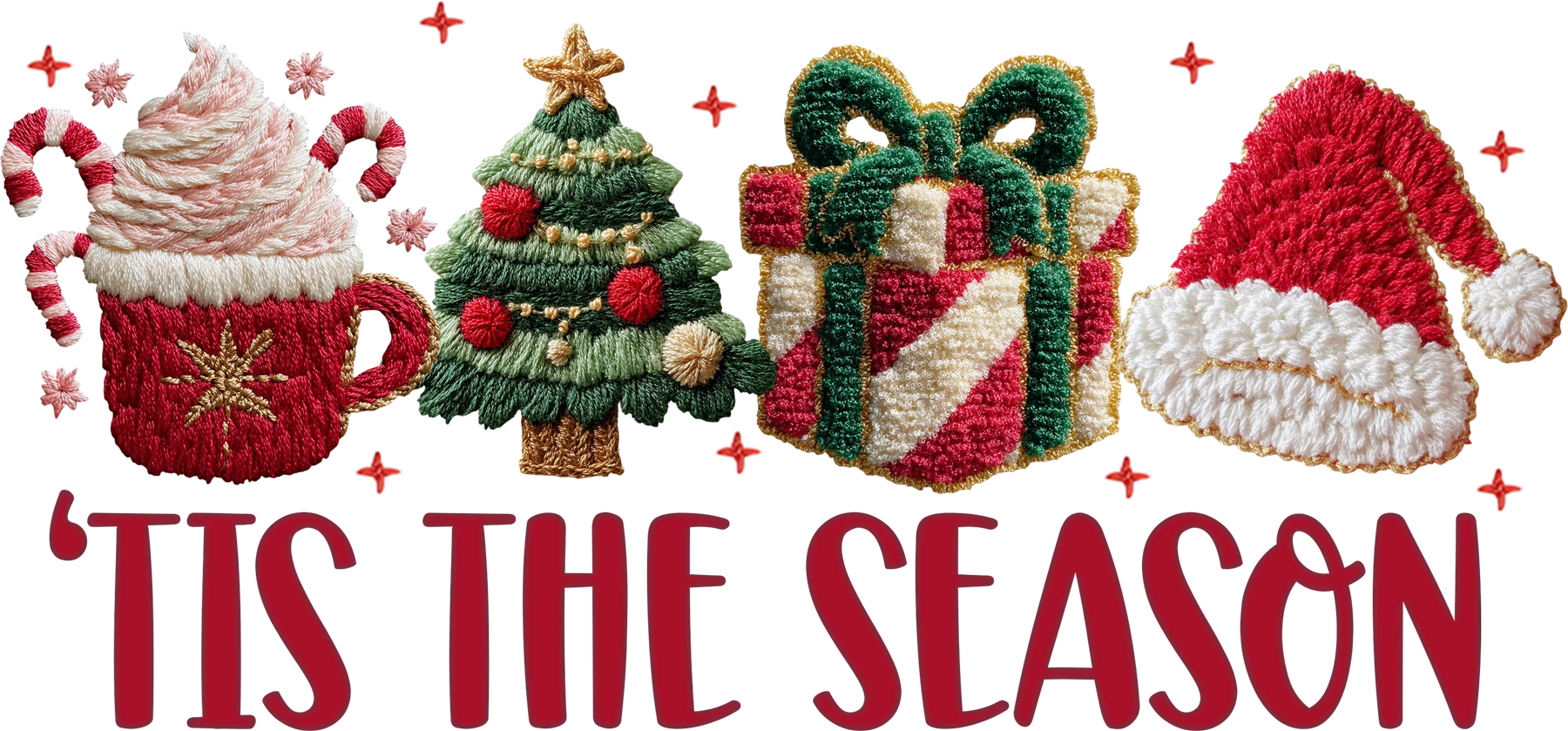 Transform your holiday apparel with this charming 'Tis The Season Christmas DTF transfer featuring beautiful embroidered-style artwork. This festive design showcases a delightful collection of Christmas elements including a Santa hat, wrapped presents, Christmas tree, hot cocoa mug, and candy canes, all artfully arranged with decorative stars and snowflakes.