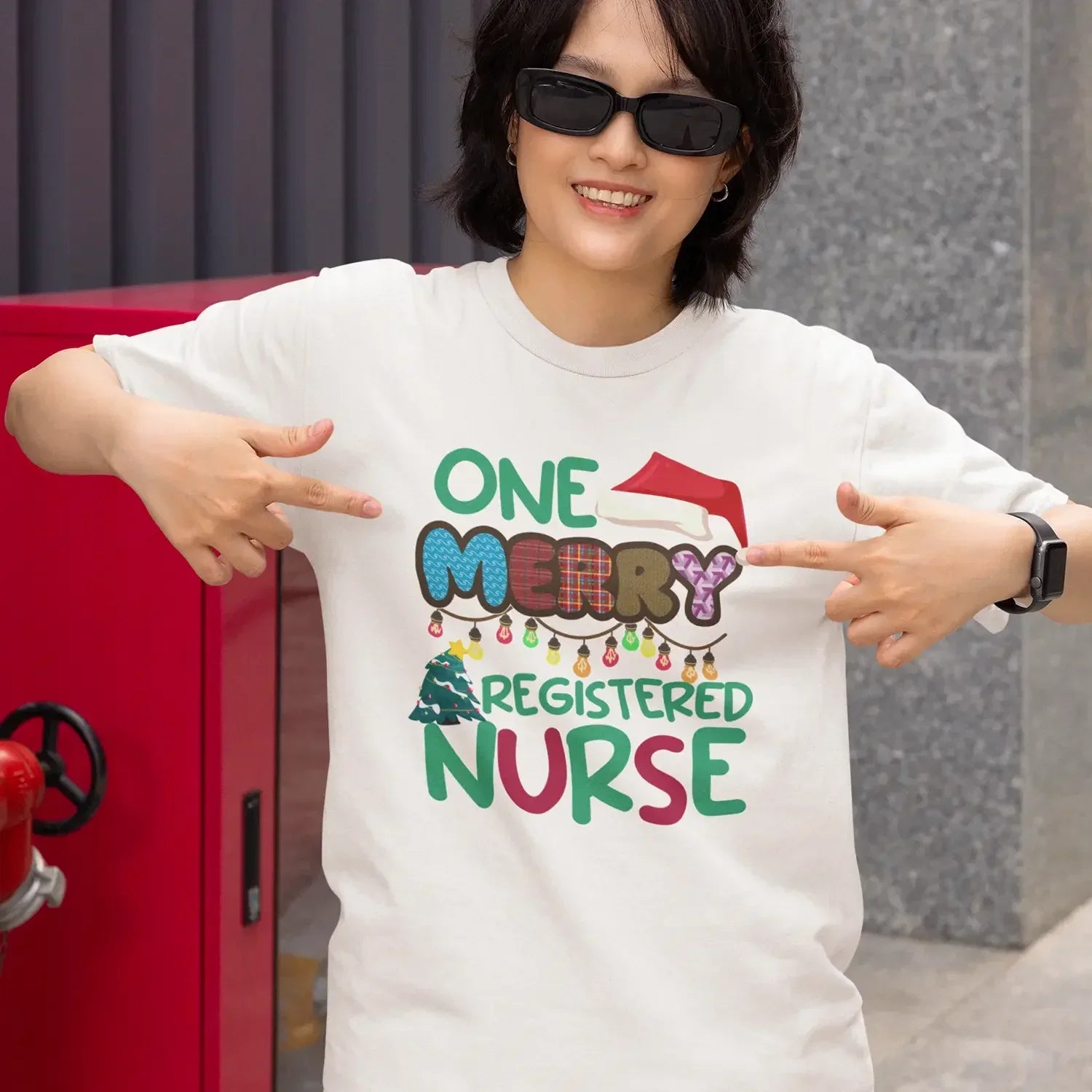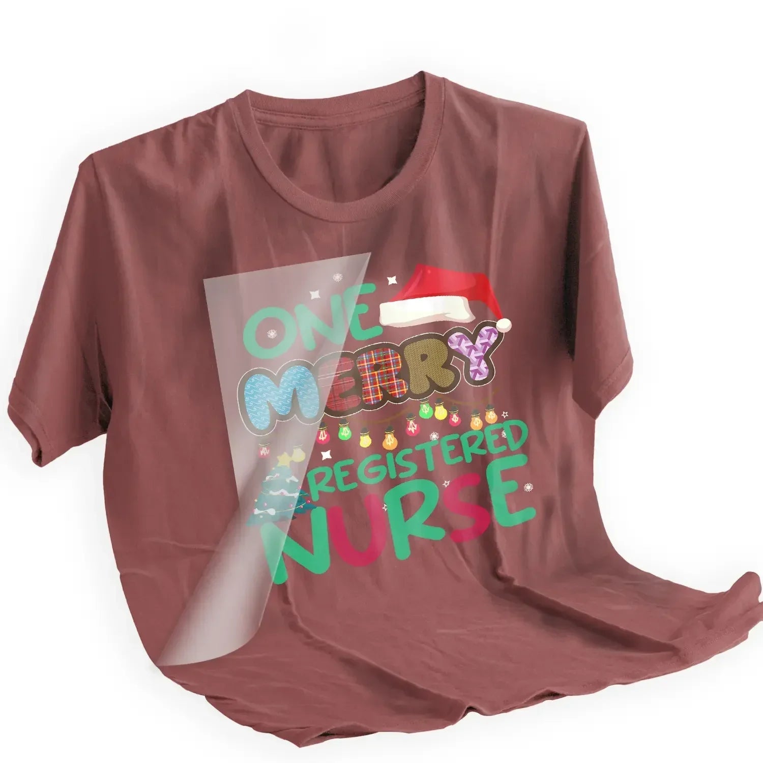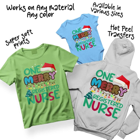 - Premium DTF prints with professional "Merry RN" text and festive nursing graphics