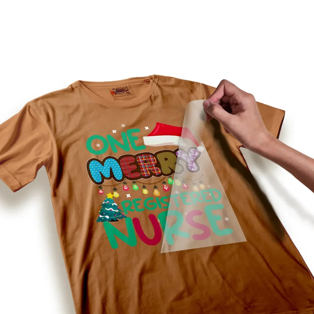 - One DTF transfer sheet with Christmas Merry RN design