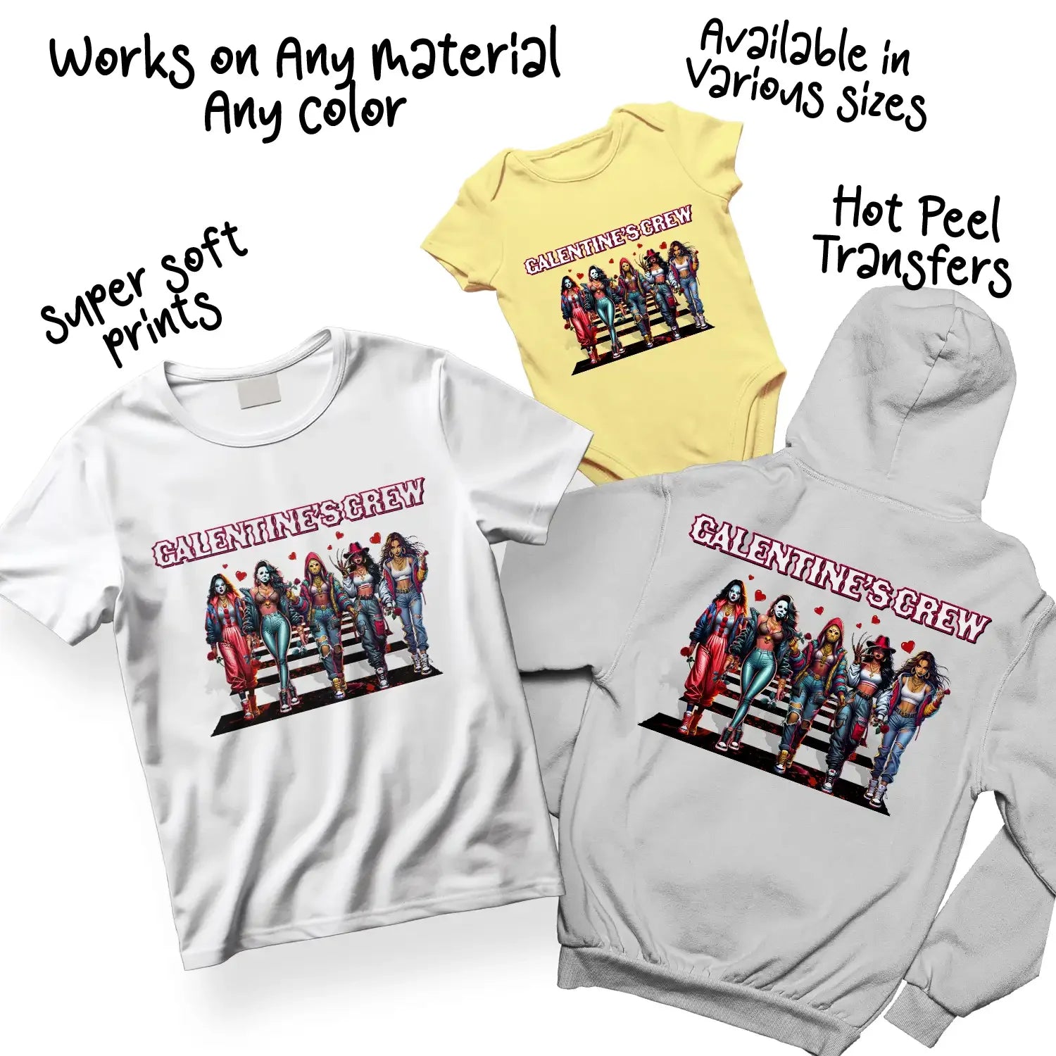 Continue building your crew wardrobe with our stylish custom DTF transfer featuring a fourth unique "Galentine's Crew" design with trendy friendship vibes. This fashionable DTF prints design brings contemporary style to crew celebration, perfect for creating modern Valentine's apparel that reflects the current trends in female friendship fashion and sisterhood pride.