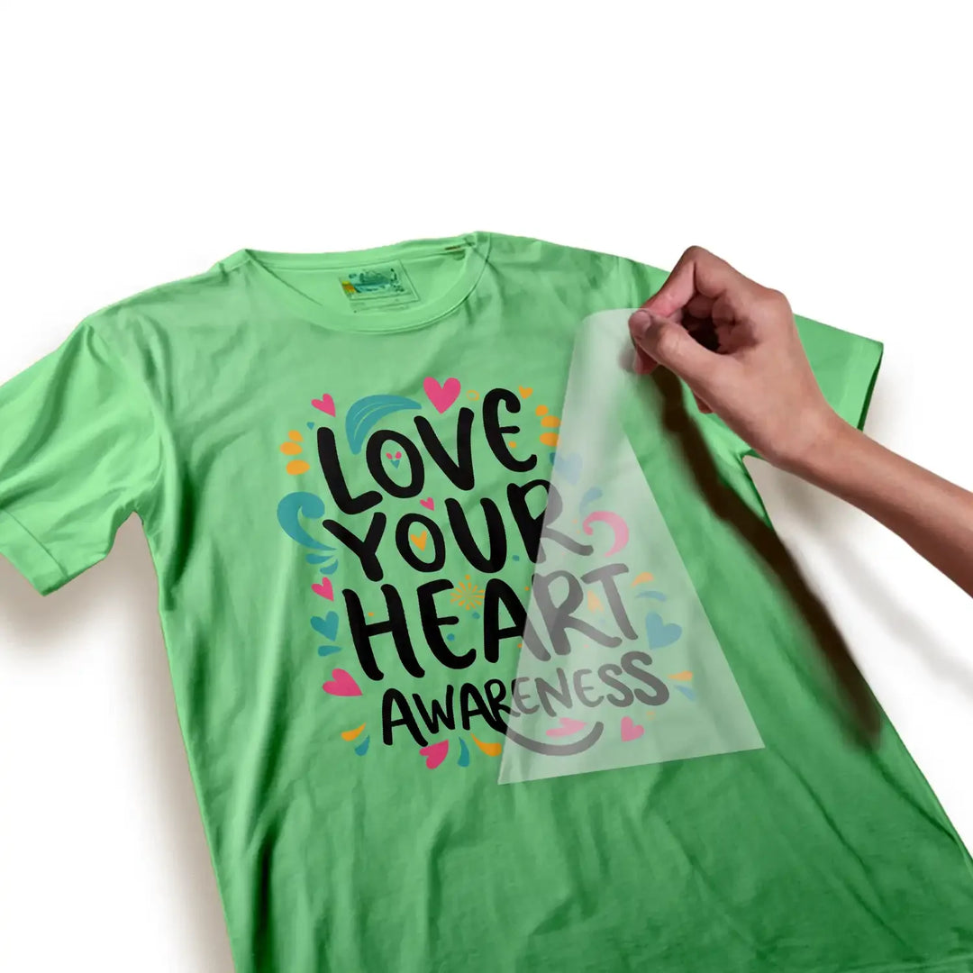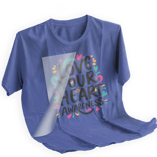 Machine wash cold, tumble dry low. Turn garment inside out before washing to preserve your DTF transfer ready to press designs and maintain the nurturing wellness messaging and heart love graphics. Learn about compatible fabrics for DTF transfers for best results.
