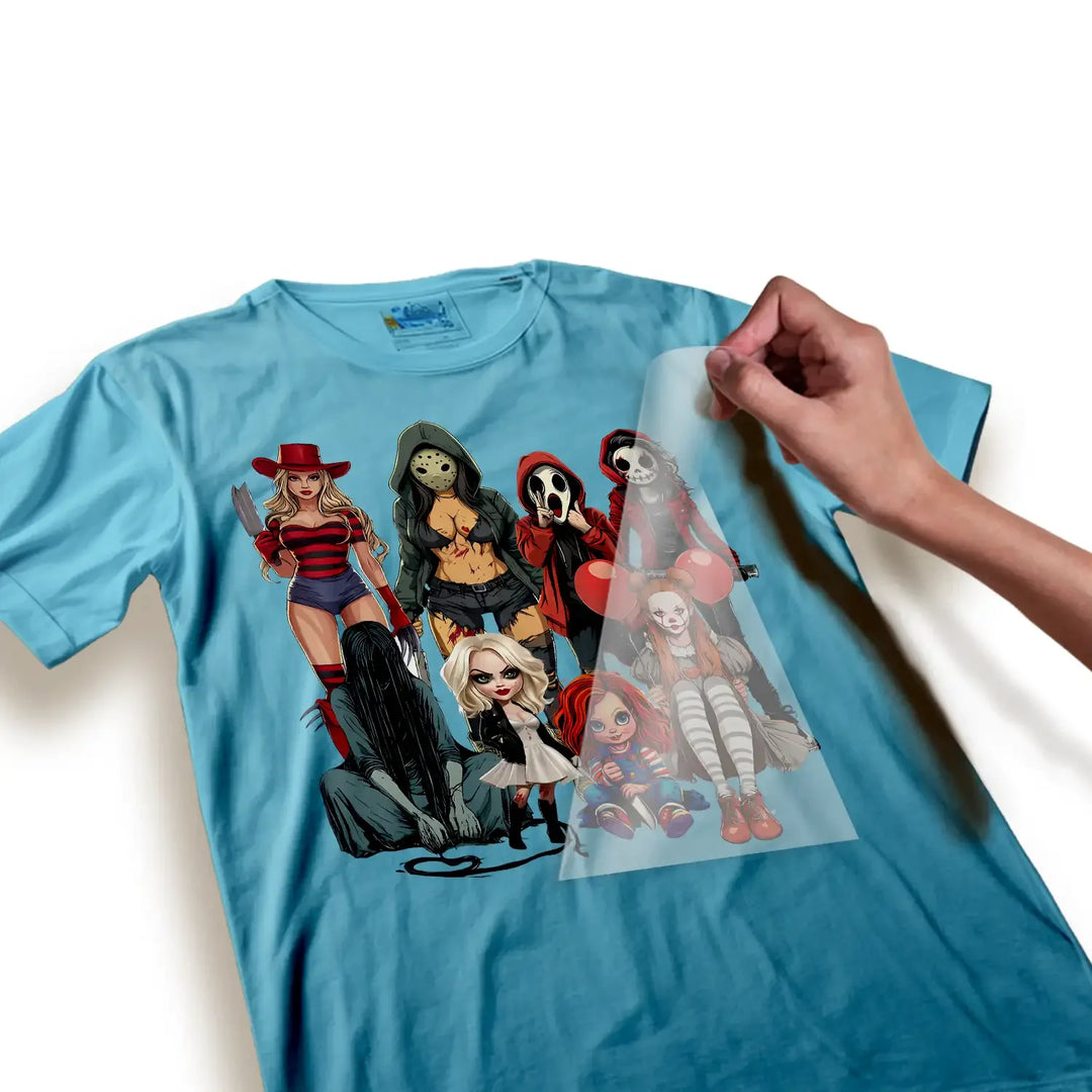 Machine wash cold, tumble dry low. Turn garment inside out before washing to preserve your DTF transfer for t-shirt designs and maintain the horror gals' spooky sisterhood styling. Learn about compatible fabrics for DTF transfers for best results.