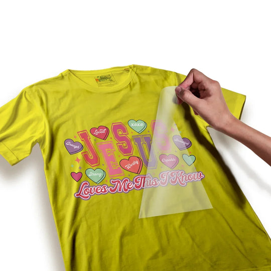 - One DTF transfer sheet with "Jesus Loves Me This I Know" design