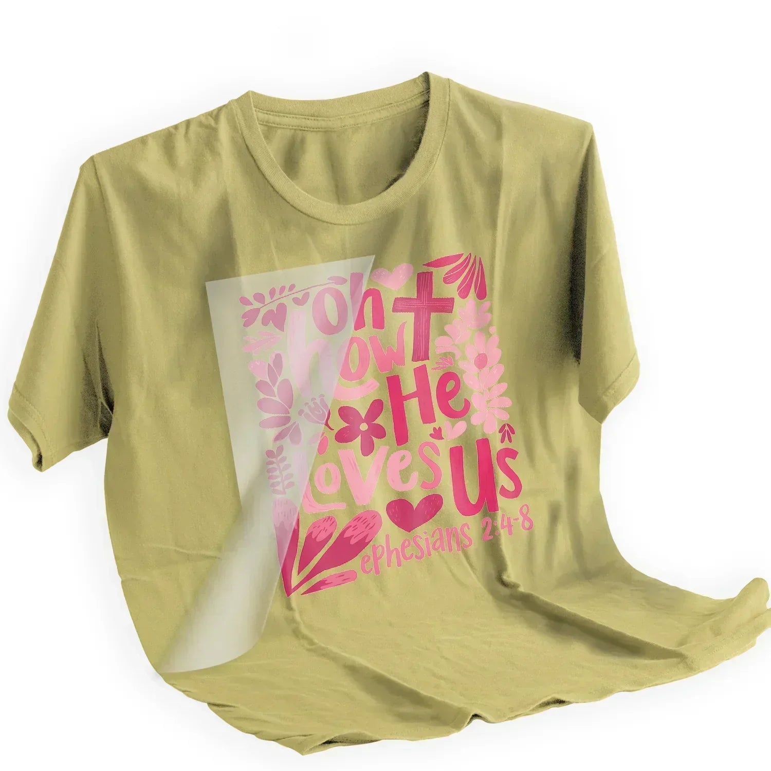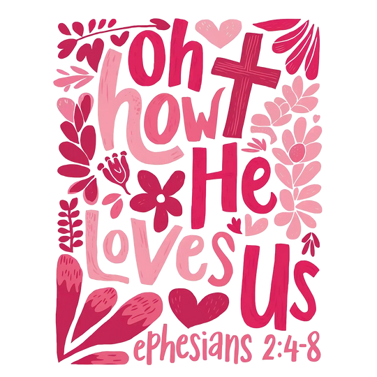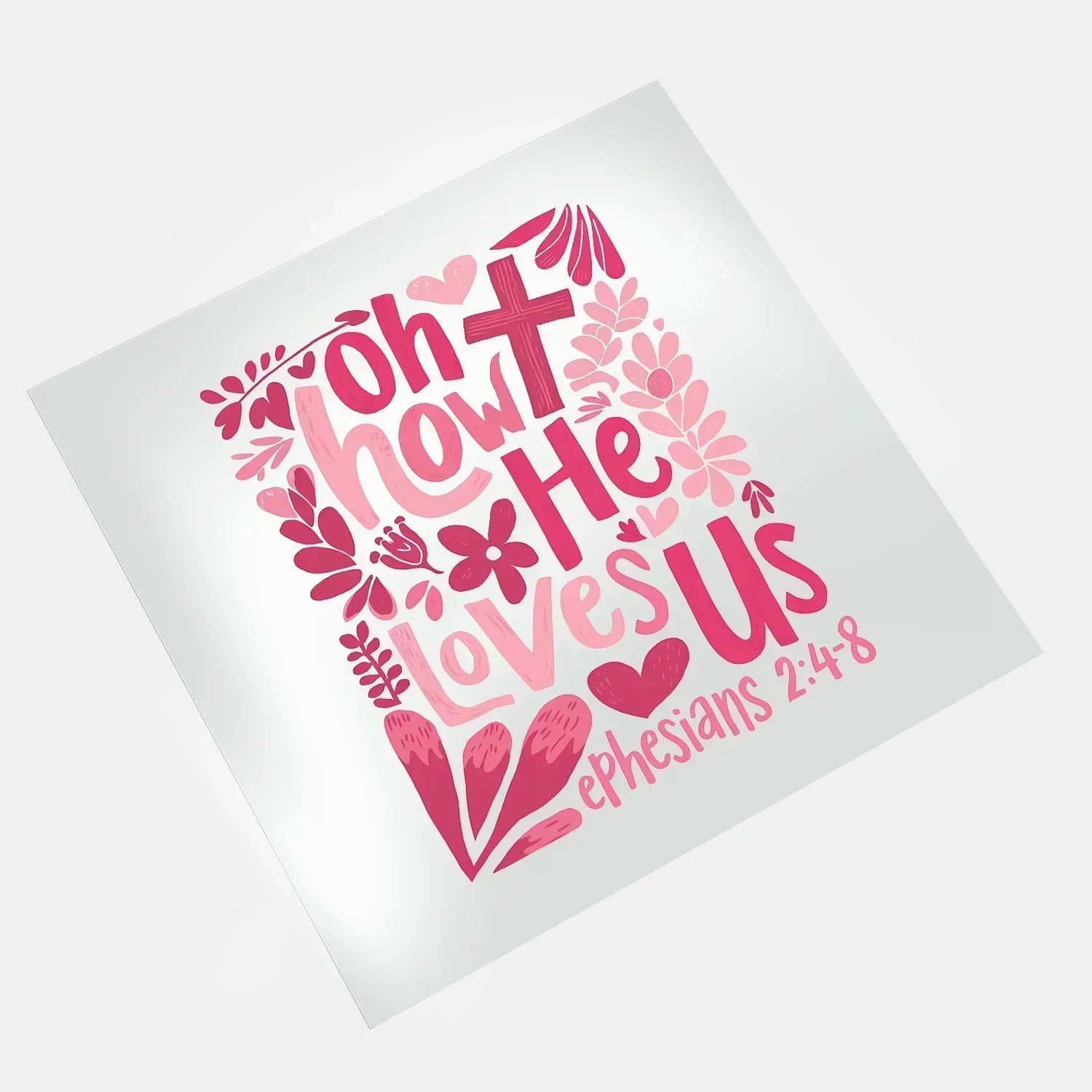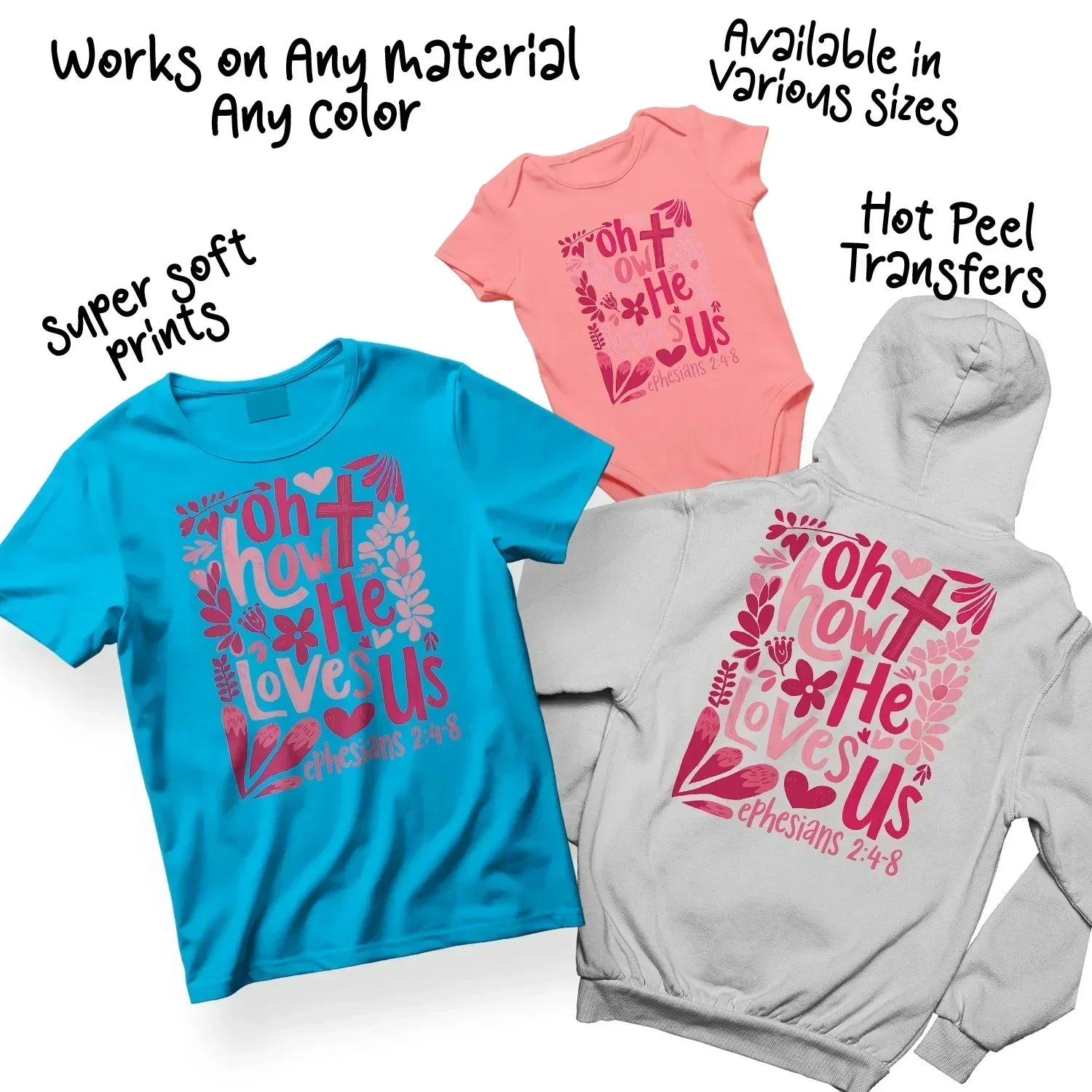 Celebrate God's incredible love with our inspiring DTF transfer ready to press featuring "Oh He Loves Us" and Ephesians 2:4-8 - a powerful reminder of God's grace and mercy. These premium DTF transfers are perfect for creating meaningful Jesus Valentine's gifts that proclaim God's amazing love for us.