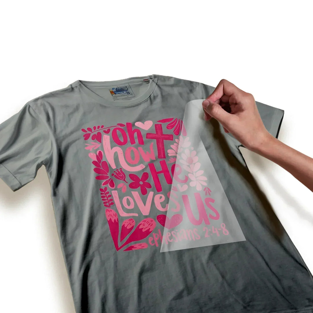 - One DTF transfer sheet with "Oh He Loves Us" Ephesians 2:4-8 design