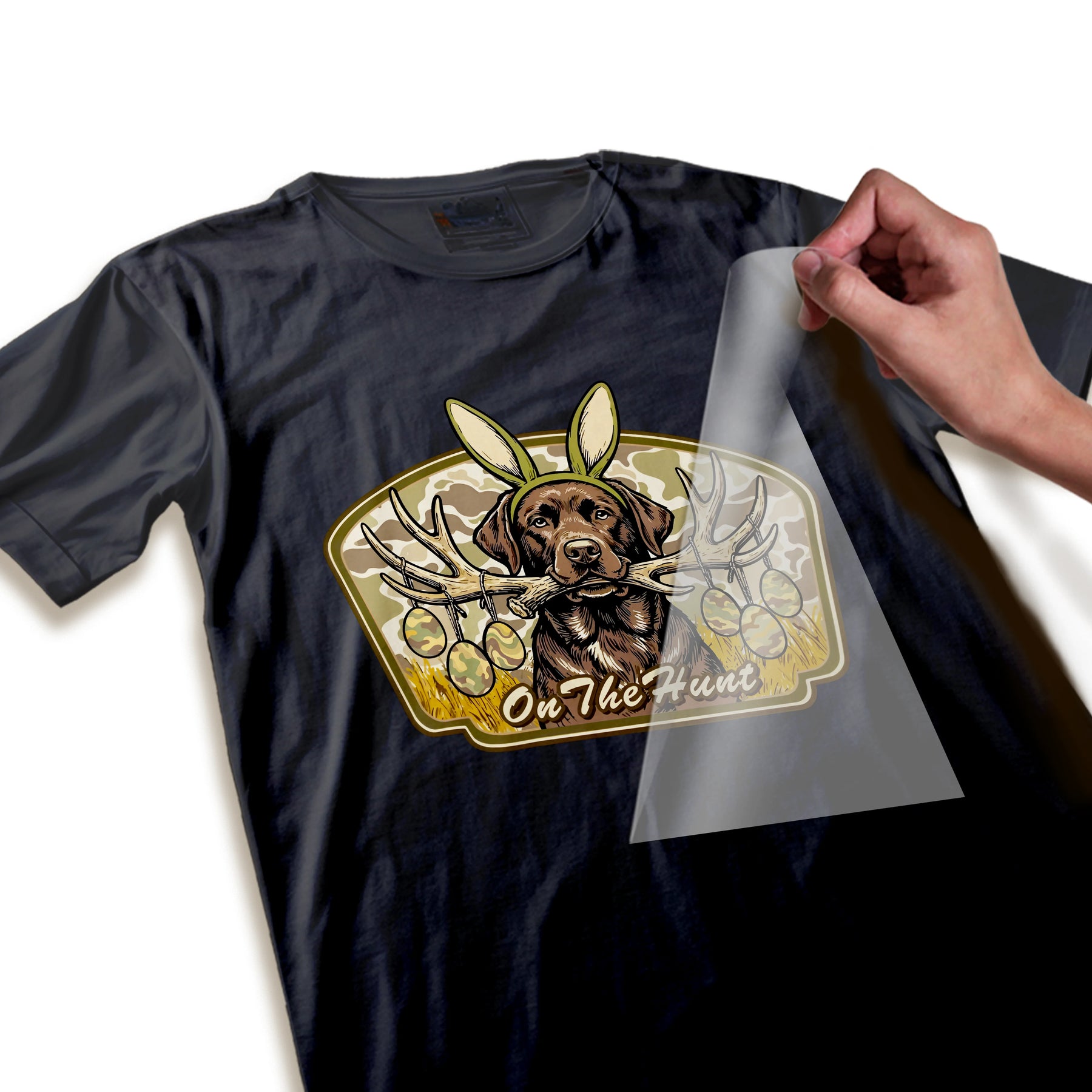Easter DTF Transfer - On The Hunt Chocolate Lab With Antlers and Camo Eggs Ready to Press