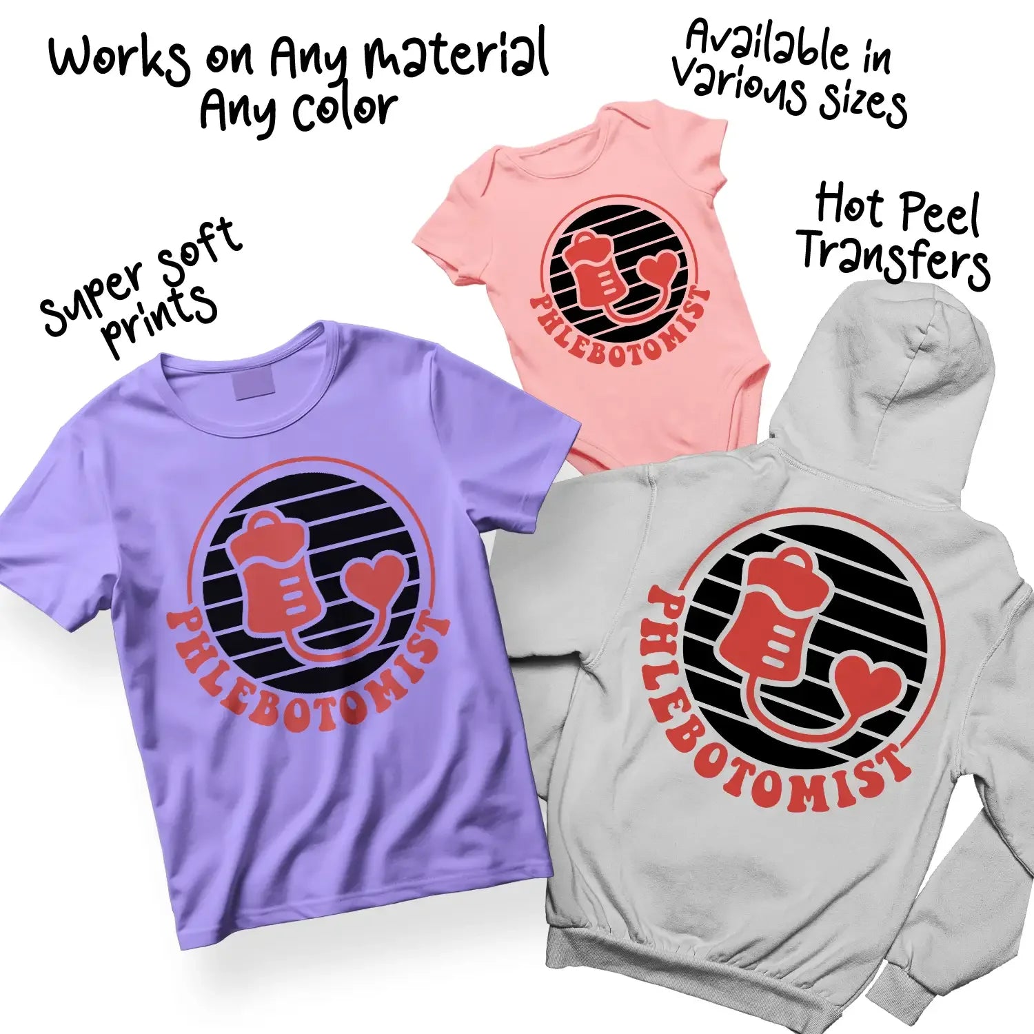 Design comprehensive healthcare apparel with these DTF transfers applications. Works wonderfully on t-shirts, hoodies, sweatshirts, tank tops, and more. Perfect for completing your professional wardrobe collection, having maximum variety options, creating the ultimate phlebotomist apparel set, or ensuring you have the most comprehensive range of professional identification styles available.