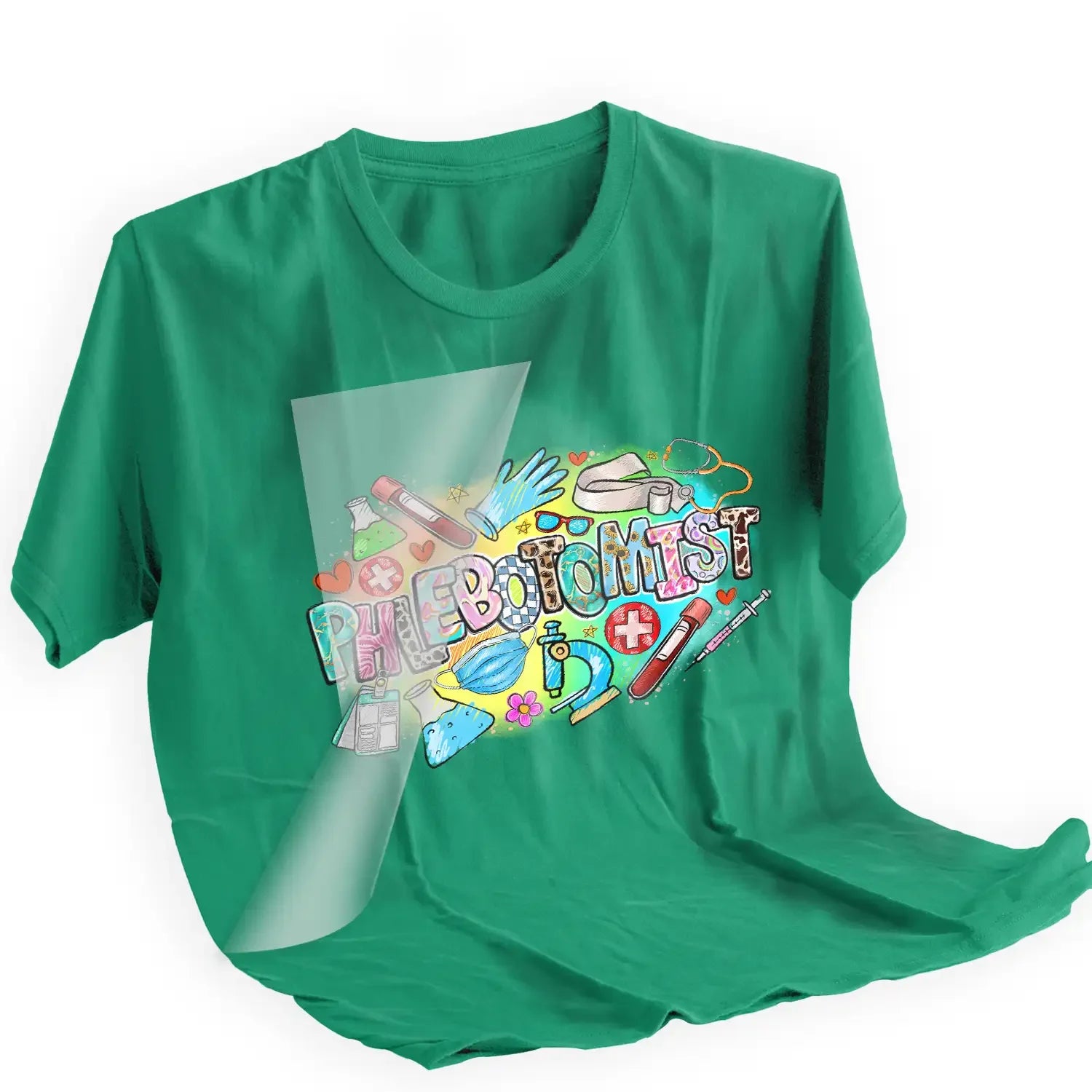 Design essential healthcare apparel with these custom DTF transfer applications. Works wonderfully on t-shirts, hoodies, sweatshirts, tank tops, and more. Perfect for all phlebotomists, healthcare professionals, medical workers, laboratory technicians, or anyone who wants simple, clear professional identification that communicates their important role in patient care and medical diagnostics.