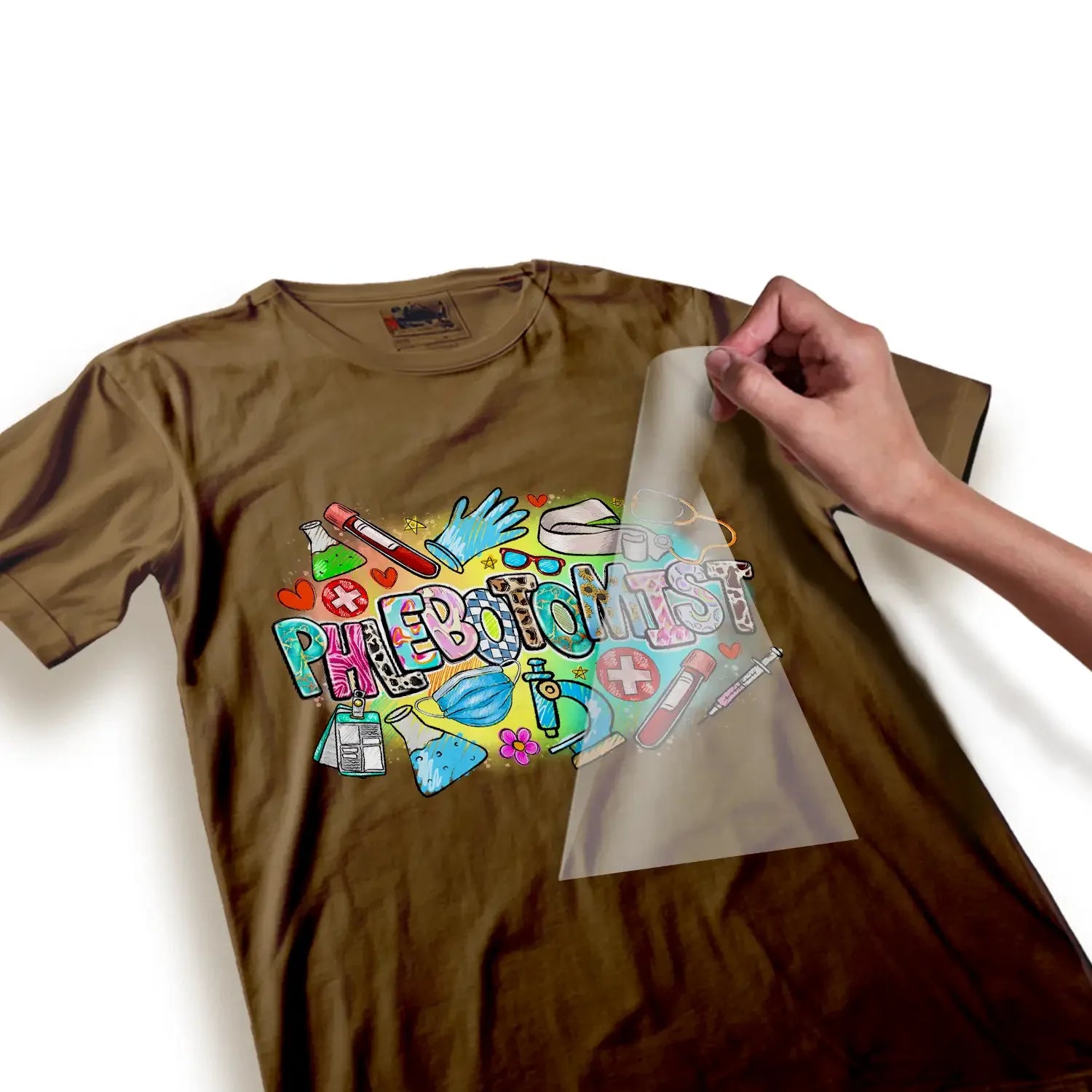 - Clean professional DTF transfer sheets with classic phlebotomist typography and medical graphics