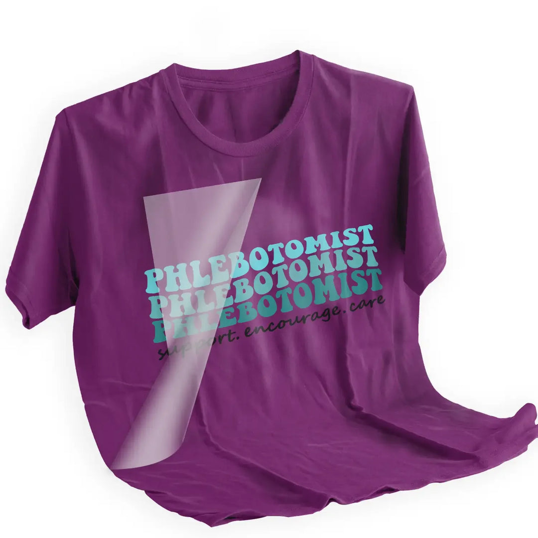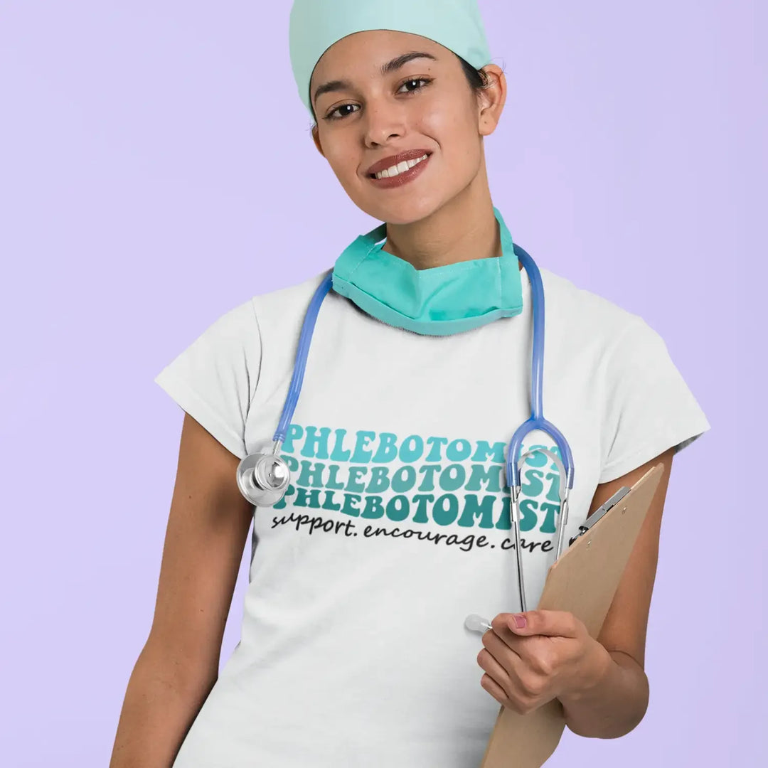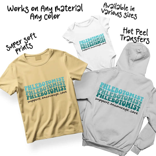 Embody healthcare values with our inspiring DTF prints featuring "Support. Encourage. Care." with compassionate phlebotomist messaging. This meaningful custom DTF transfer design highlights the core values of healthcare professionals, perfect for creating purposeful apparel that reflects the heart of patient care and the compassionate mission of every dedicated phlebotomist.