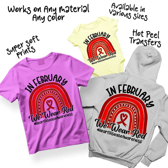 - Premium DTF transfer ready to press with "In February We Wear Red" design