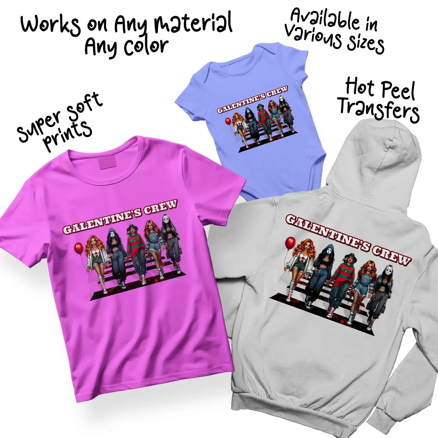 - Premium DTF transfers with playful Galentine's Crew design