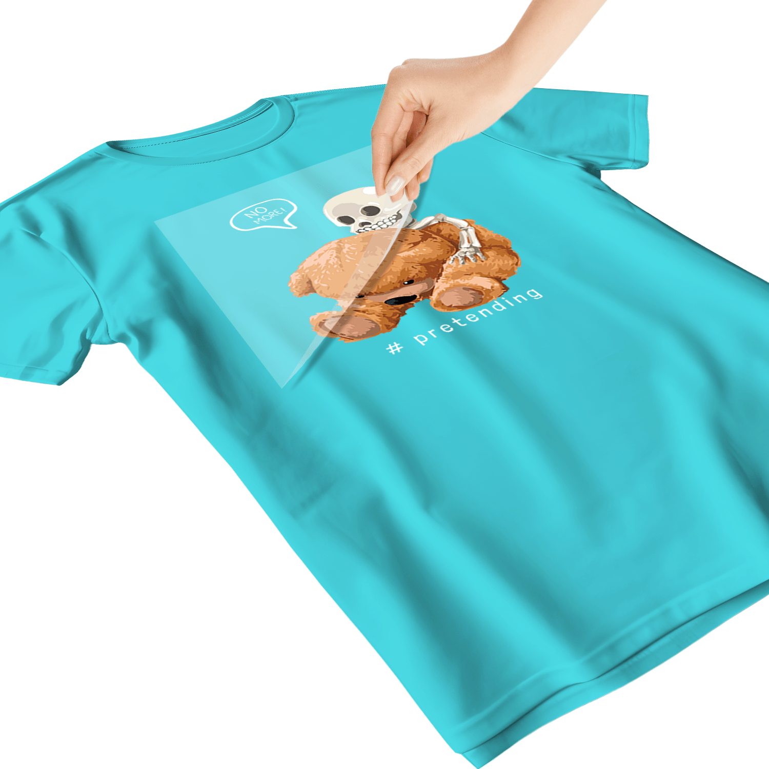 - PLACE – Position your DTF transfer on the garment with the design side DOWN (colored side touching fabric).