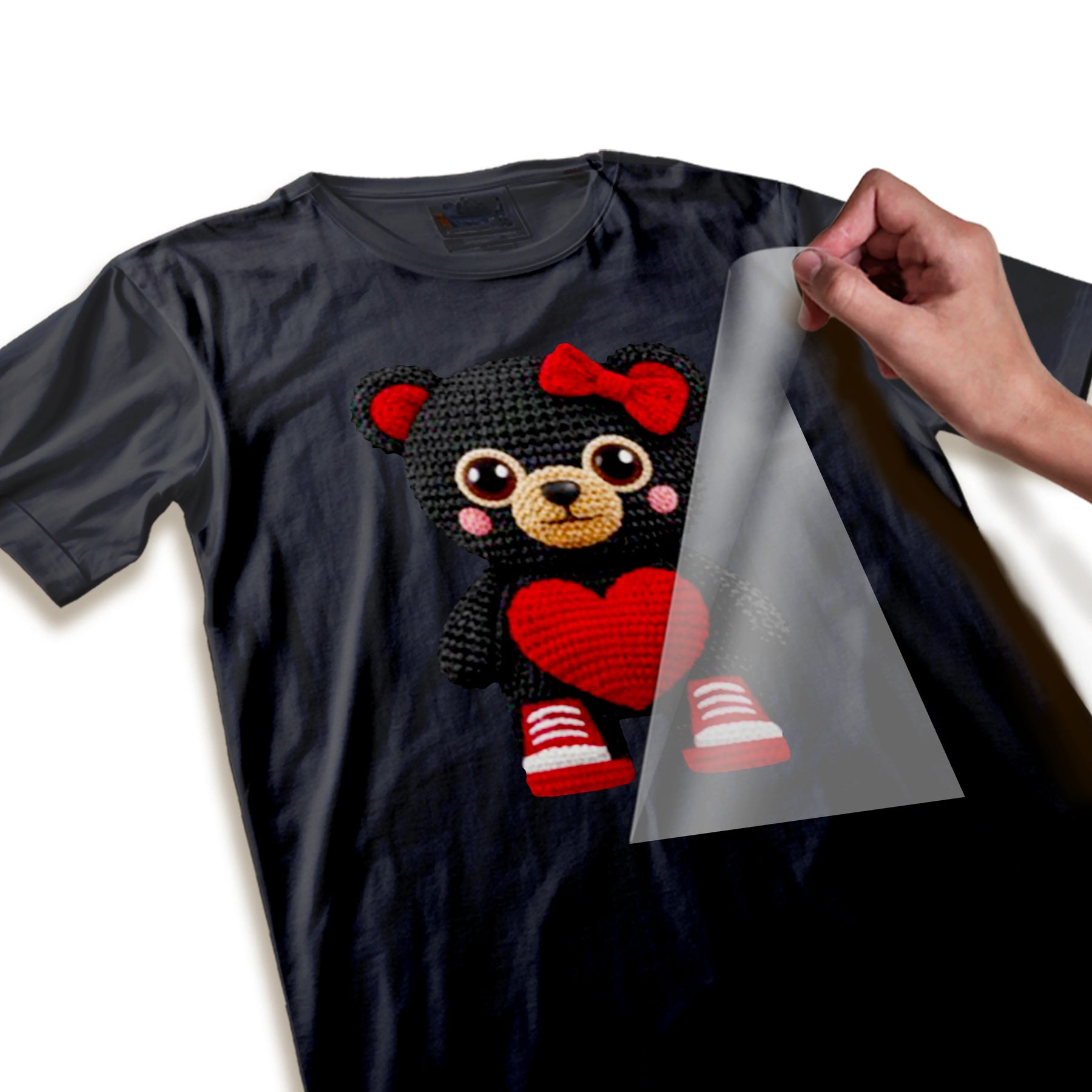 - PLACE – Position your DTF transfer on the garment with the design side DOWN (colored side touching fabric).